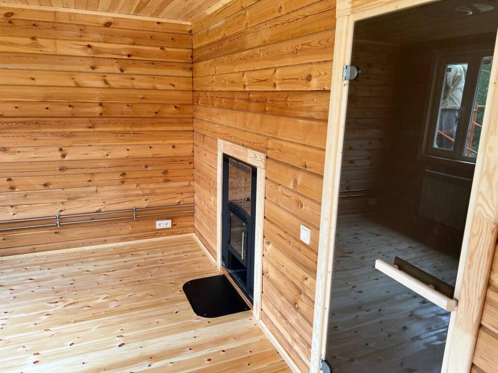 Дверь в парилку/мойку - стеклянная.