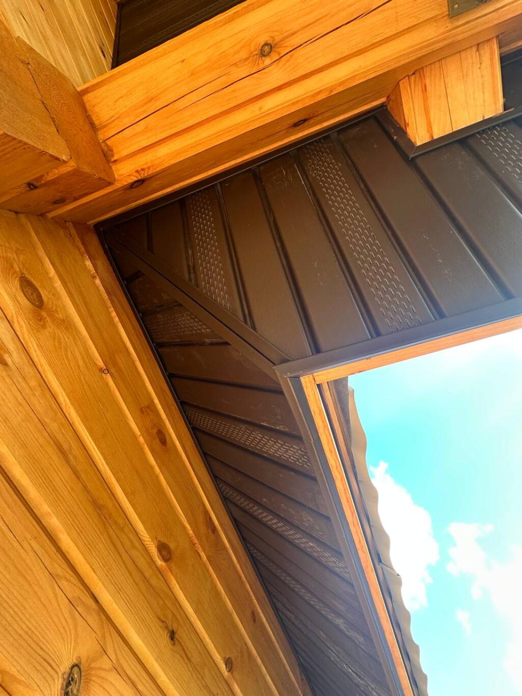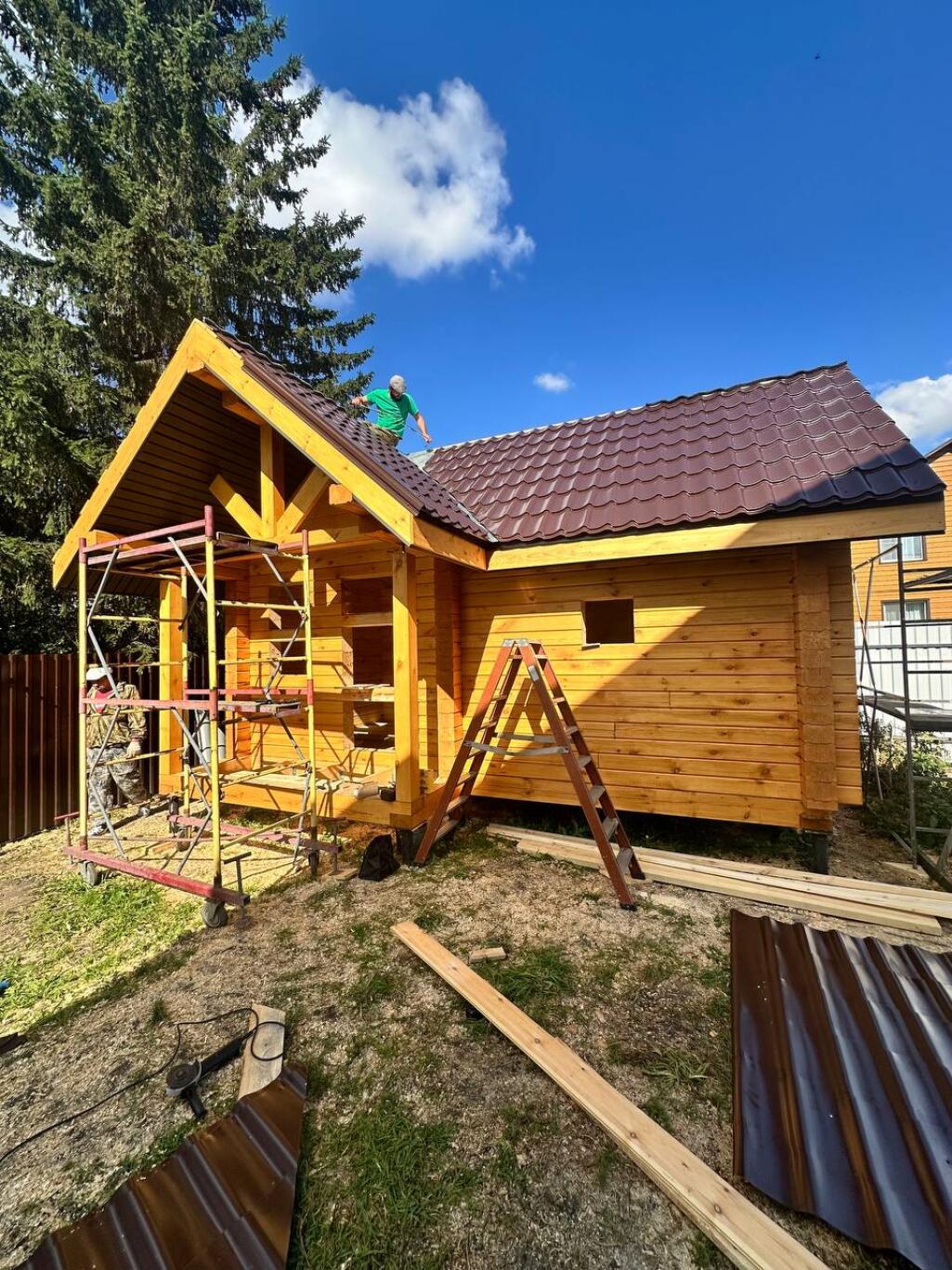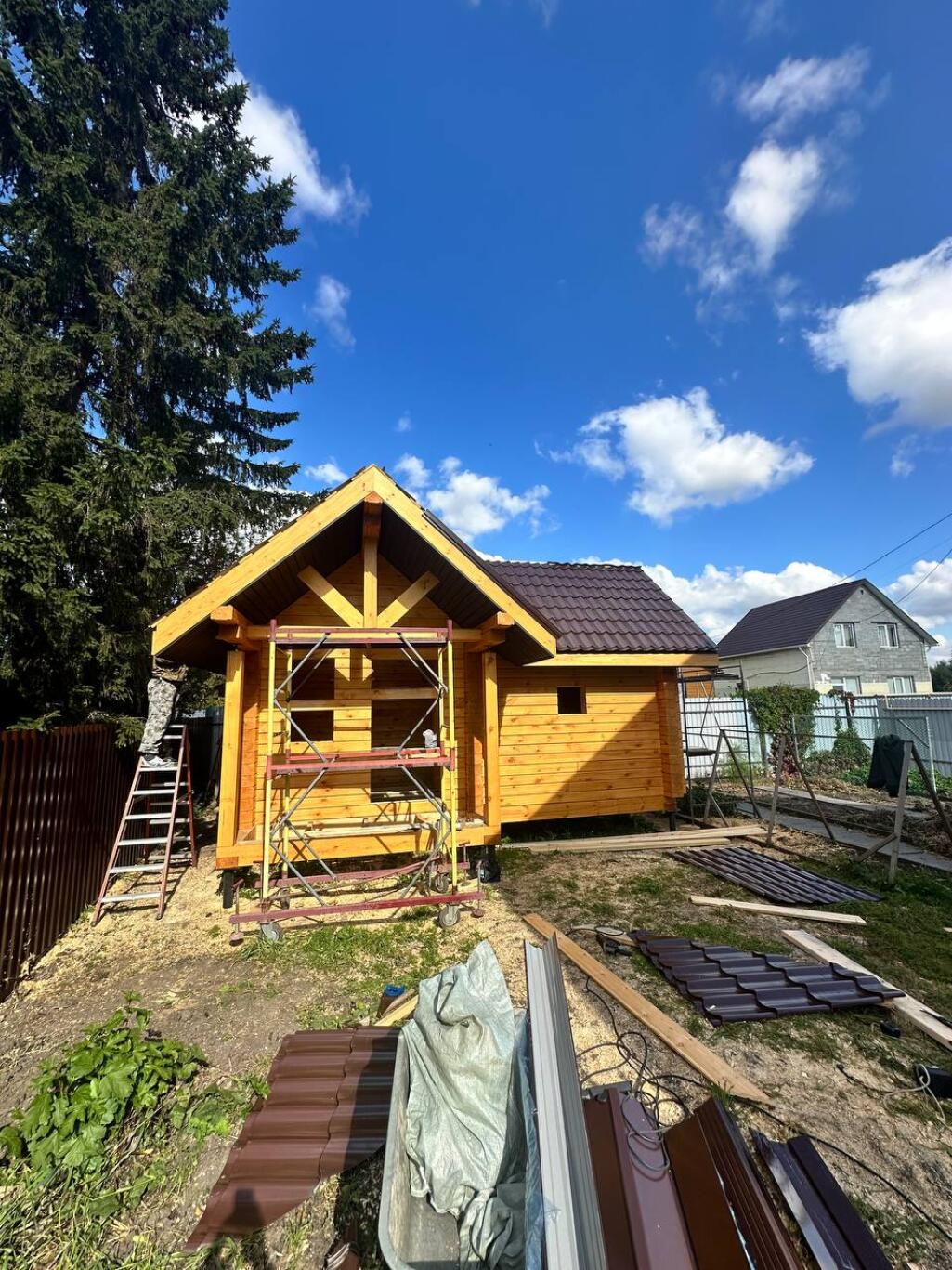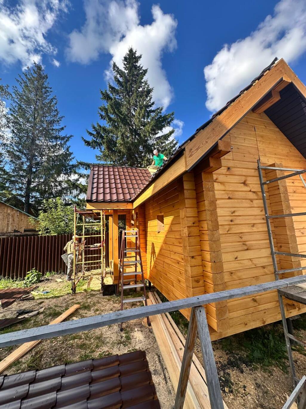 Кровля - металлочерепица или профлист (цвет на выбор заказчика) с проложением изоспана и контробрешёткой. Обрешетка не сплошная из необрезной доски 25х150 мм.
